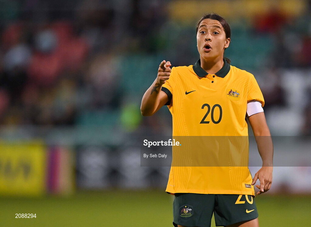 21 September 2021; Sam Kerr of Australia during the women's international friendly match between Republic of Ireland and Australia at Tallaght Stadium in Dublin. Photo by Seb Daly/Sportsfile