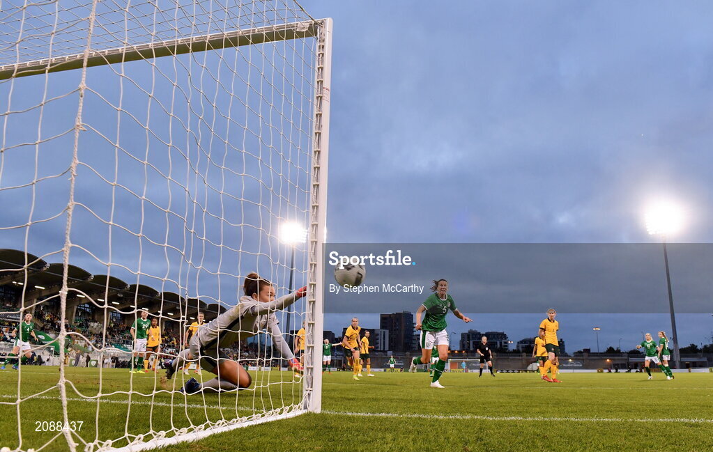 21 September 2021; Australia goalkeeper Mackenzie Arnold is beaten by a shot from Denise O'Sullivan of Republic of Ireland for their second goal during the women's international friendly match between Republic of Ireland and Australia at Tallaght Stadium in Dublin. Photo by Stephen McCarthy/Sportsfile