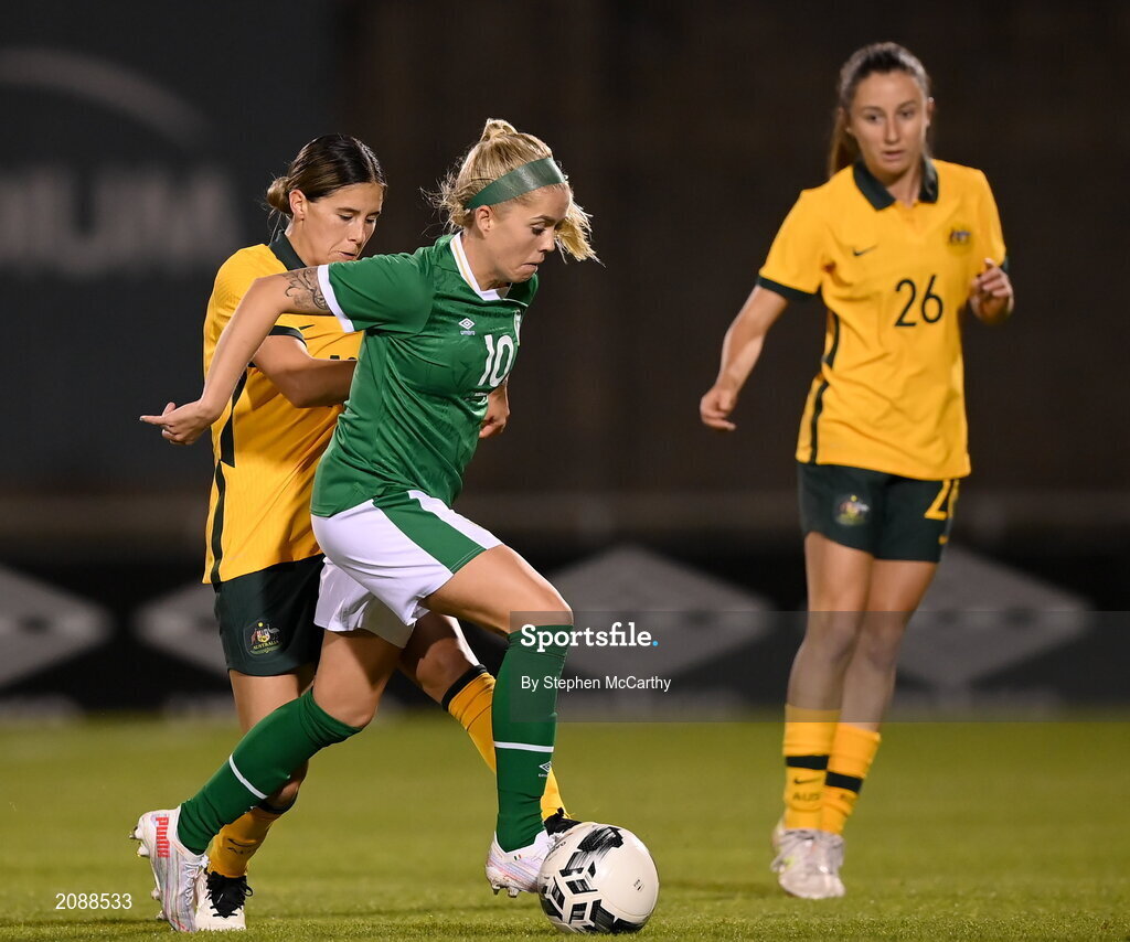 21 September 2021; Denise O'Sullivan of Republic of Ireland in action against Kyra Cooney-Cross of Australia during the women's international friendly match between Republic of Ireland and Australia at Tallaght Stadium in Dublin. Photo by Stephen McCarthy/Sportsfile