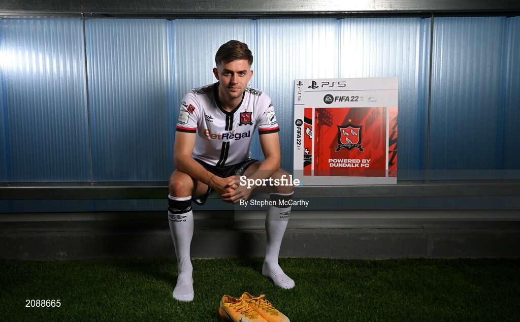 22 September 2021; SSE Airtricity League FIFA 22 Club Packs are back. Featuring the individual club crest of all 10 Premier Division teams, these exclusive sleeves will be available to download free from https://www.ea.com/games/fifa/fifa-22 when the game launches Friday, 1st October! Will Patching of Dundalk during the launch at Sport Ireland National Indoor Arena at the Sport Ireland Campus in Dublin. Photo by Stephen McCarthy/Sportsfile