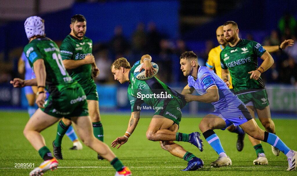 24 September 2021; John Porch of Connacht is tackled by Tomos Williams of Cardiff Blues during the United Rugby Championship match between Cardiff Blues and Connacht at Arms Park in Cardifff, Wales. Photo by Mark Lewis/Sportsfile