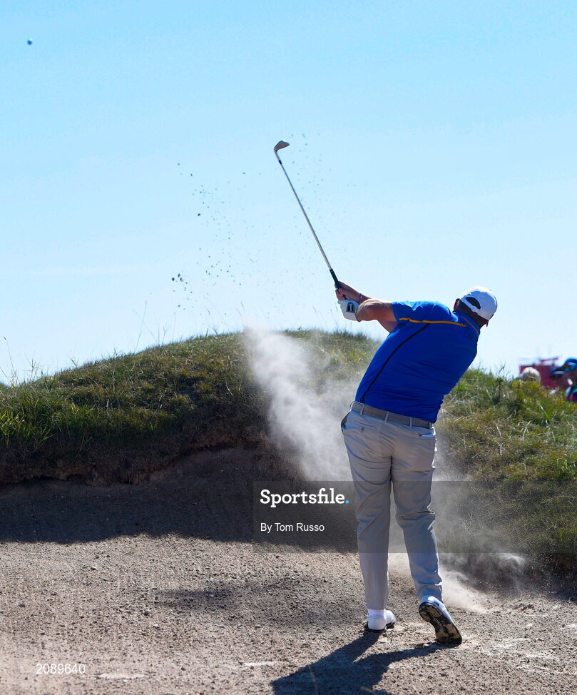 24 September 2021; Shane Lowry of Team Europe chips from a bunker during his Friday afternoon fourballs match with Rory McIlroy against Tony Finau and Harris English of Team USA at the Ryder Cup 2021 Matches at Whistling Straits in Kohler, Wisconsin, USA. Photo by Tom Russo/Sportsfile
