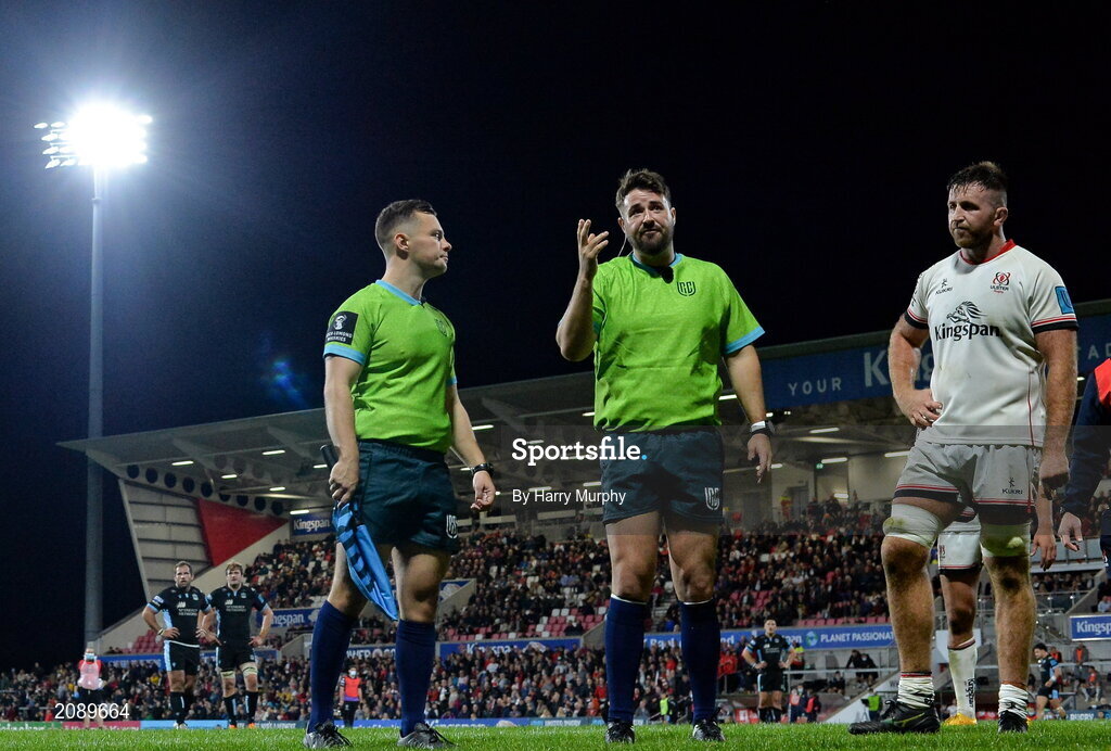 24 September 2021; Referee Ben Whitehouse watches a TMO during the United Rugby Championship match between Ulster and Glasgow Warriors at Kingspan Stadium in Belfast. Photo by Harry Murphy/Sportsfile