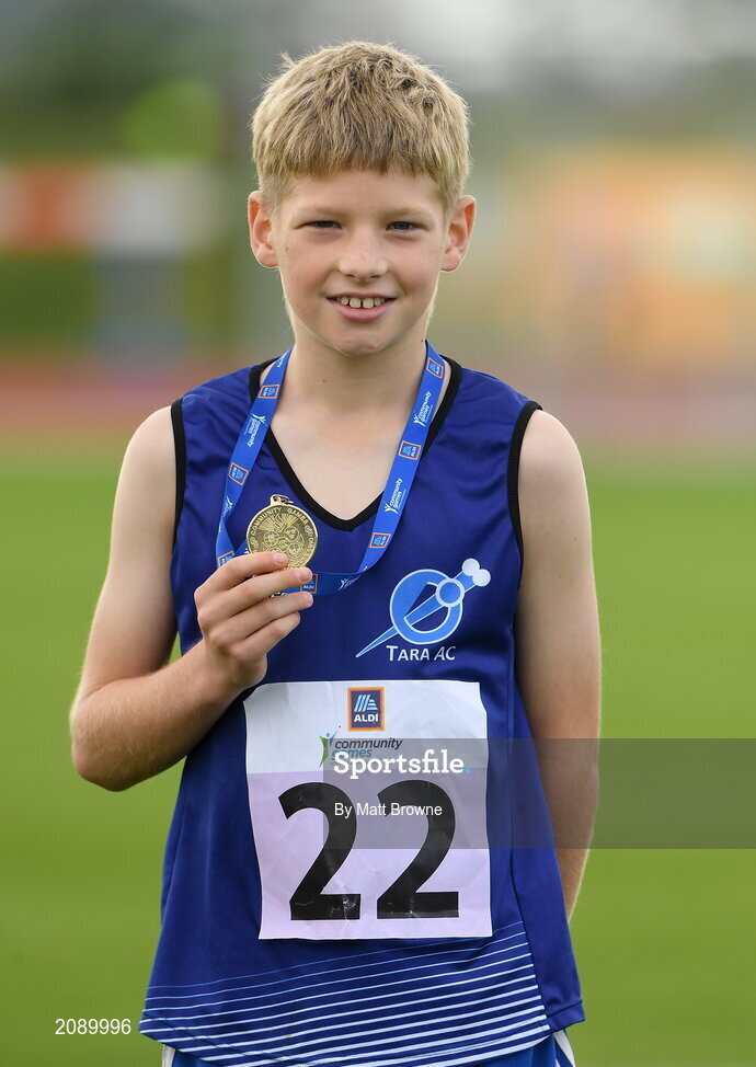 25 September 2021; Oisin Giles from Skyrne, Meath, with his gold medal after the Boys under-12 100 metre during the Aldi Community Games Track and Field Athletics finals at Carlow IT Sports Campus in Carlow. Photo by Matt Browne/Sportsfile