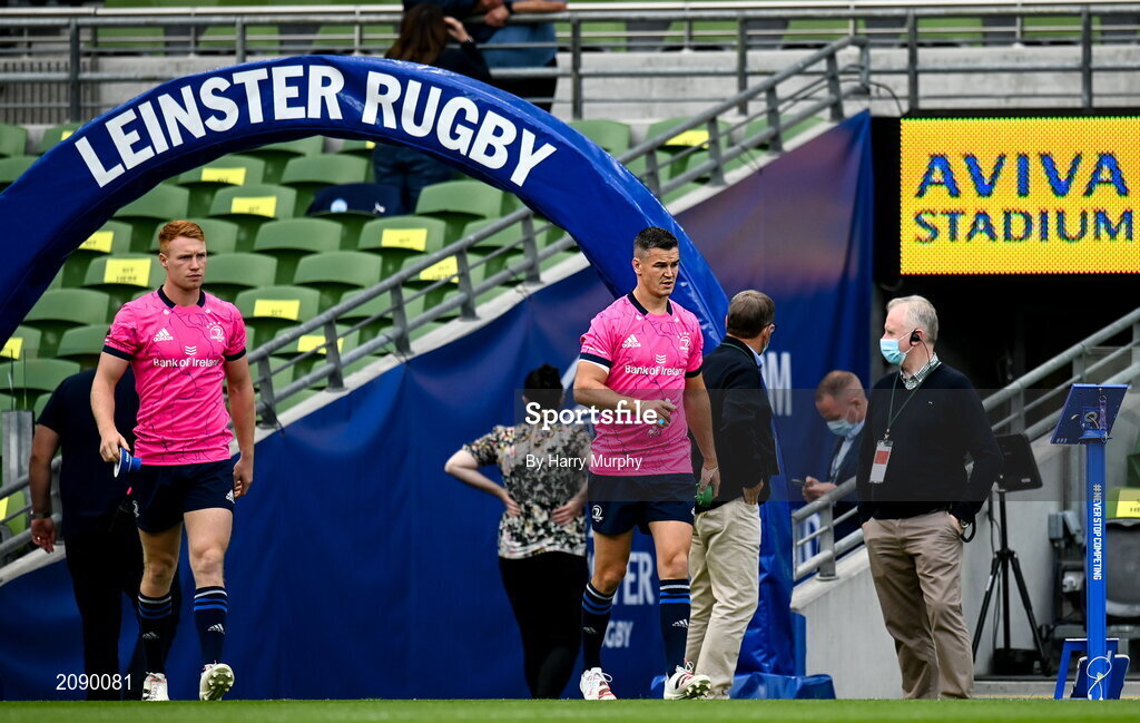 25 September 2021; Jonathan Sexton, right and Ciarán Frawley of Leinster before the United Rugby Championship match between Leinster and Vodacom Bulls at the Aviva Stadium in Dublin. Photo by Harry Murphy/Sportsfile