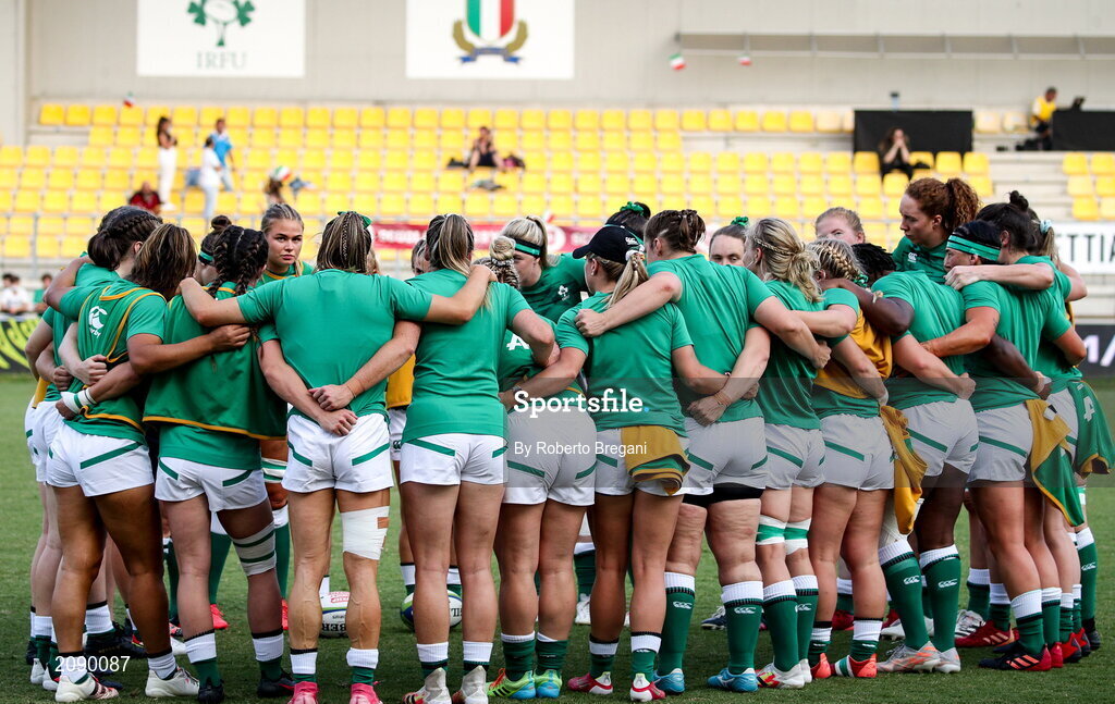 25 September 2021; Ireland players huddle before the Rugby World Cup 2022 Europe qualifying tournament match between Ireland and Scotland at Stadio Sergio Lanfranchi in Parma, Italy. Photo by Roberto Bregani/Sportsfile