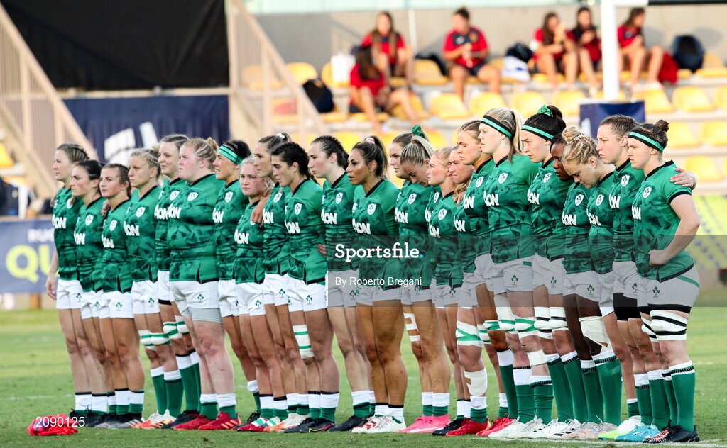 25 September 2021; Ireland players stand for the national anthem before the Rugby World Cup 2022 Europe qualifying tournament match between Ireland and Scotland at Stadio Sergio Lanfranchi in Parma, Italy. Photo by Roberto Bregani/Sportsfile