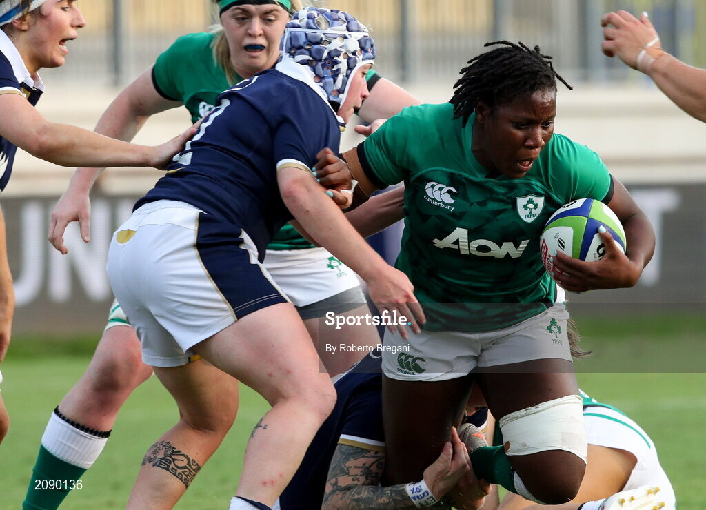 25 September 2021; Linda Djougang of Ireland in action against Lana Skeldon of Scotland during the Rugby World Cup 2022 Europe qualifying tournament match between Ireland and Scotland at Stadio Sergio Lanfranchi in Parma, Italy. Photo by Roberto Bregani/Sportsfile