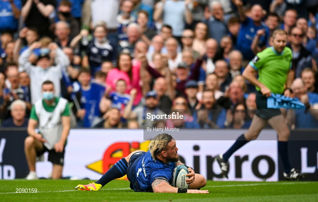25 September 2021; Andrew Porter of Leinster dives over to score his side's second try during the United Rugby Championship match between Leinster and Vodacom Bulls at the Aviva Stadium in Dublin. Photo by Harry Murphy/Sportsfile
