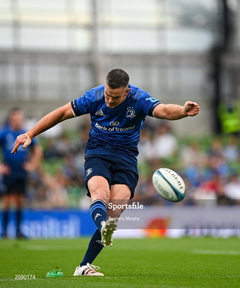 25 September 2021; Jonathan Sexton of Leinster kicks a conversion during the United Rugby Championship match between Leinster and Vodacom Bulls at the Aviva Stadium in Dublin. Photo by Harry Murphy/Sportsfile