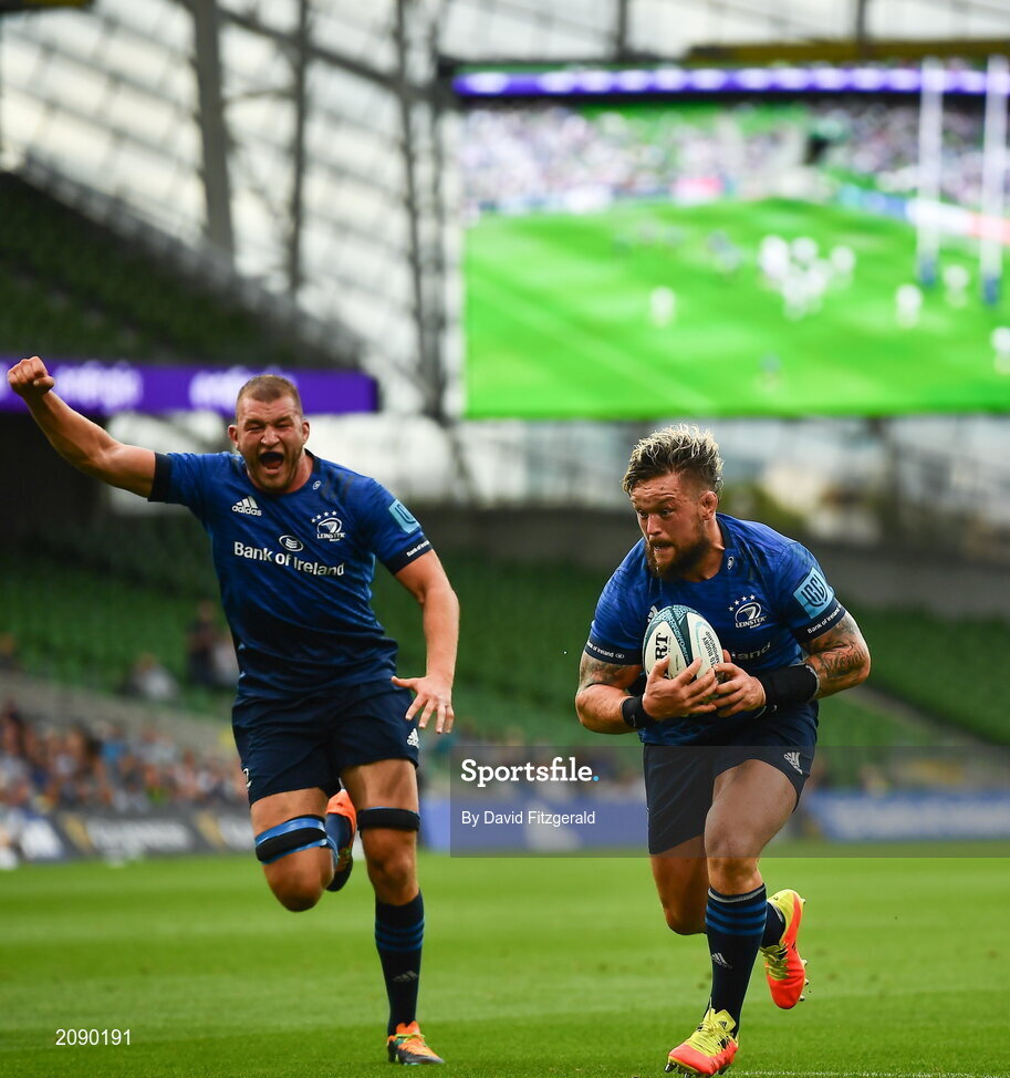25 September 2021; Andrew Porter of Leinster on his way to scoring his side's second try during the United Rugby Championship match between Leinster and Vodacom Bulls at Aviva Stadium in Dublin. Photo by David Fitzgerald/Sportsfile