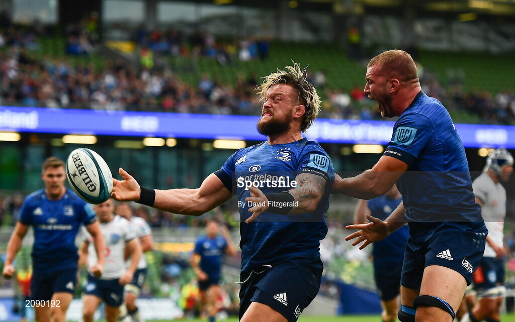 25 September 2021; Andrew Porter of Leinster, left, celebrates after scoring his side's second try with team-mate Ross Molony during the United Rugby Championship match between Leinster and Vodacom Bulls at Aviva Stadium in Dublin. Photo by David Fitzgerald/Sportsfile