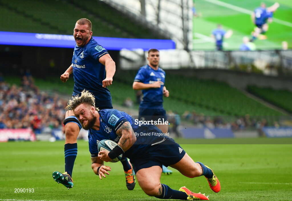 25 September 2021; Andrew Porter of Leinster scores his side's second try during the United Rugby Championship match between Leinster and Vodacom Bulls at Aviva Stadium in Dublin. Photo by David Fitzgerald/Sportsfile