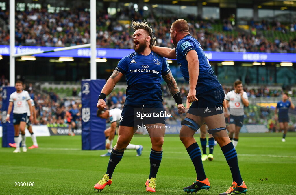 25 September 2021; Andrew Porter of Leinster, left, celebrates after scoring his side's second try with team-mate Ross Molony during the United Rugby Championship match between Leinster and Vodacom Bulls at Aviva Stadium in Dublin. Photo by David Fitzgerald/Sportsfile