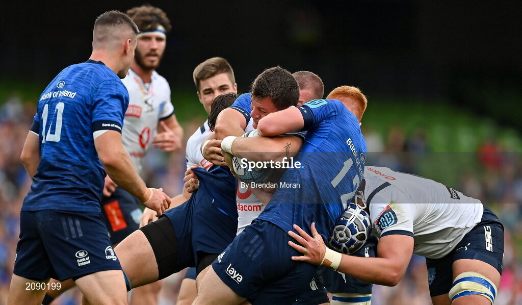 25 September 2021; Elrigh Louw of Vodacom Bulls is tackled by Ciarán Frawley of Leinster during the United Rugby Championship match between Leinster and Vodacom Bulls at Aviva Stadium in Dublin. Photo by Brendan Moran/Sportsfile