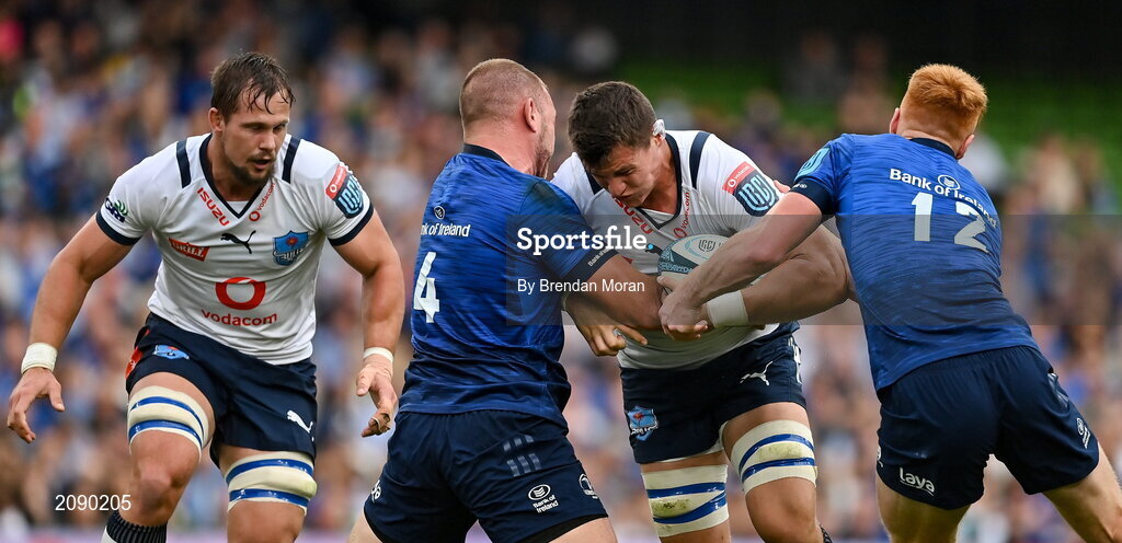 25 September 2021; Elrigh Louw of Vodacom Bulls is tackled by Ross Molony, left, and Ciarán Frawley of Leinster during the United Rugby Championship match between Leinster and Vodacom Bulls at Aviva Stadium in Dublin. Photo by Brendan Moran/Sportsfile
