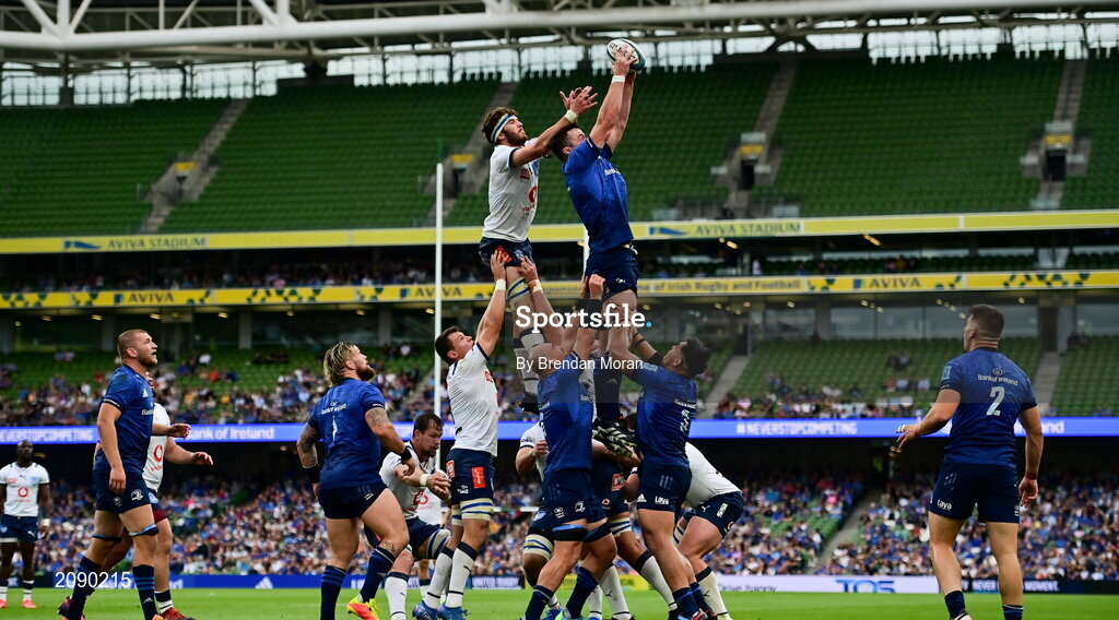 25 September 2021; James Ryan of Leinster steals a lineout from Ruan Nortje of Vodacom Bulls dduring the United Rugby Championship match between Leinster and Vodacom Bulls at Aviva Stadium in Dublin. Photo by Brendan Moran/Sportsfile