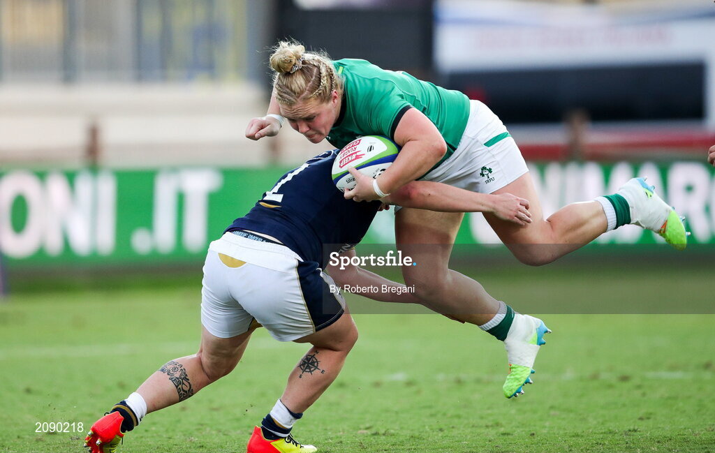 25 September 2021; Cliodhna Moloney of Ireland is tackled by Lana Skeldon of Scotland during the Rugby World Cup 2022 Europe qualifying tournament match between Ireland and Scotland at Stadio Sergio Lanfranchi in Parma, Italy. Photo by Roberto Bregani/Sportsfile