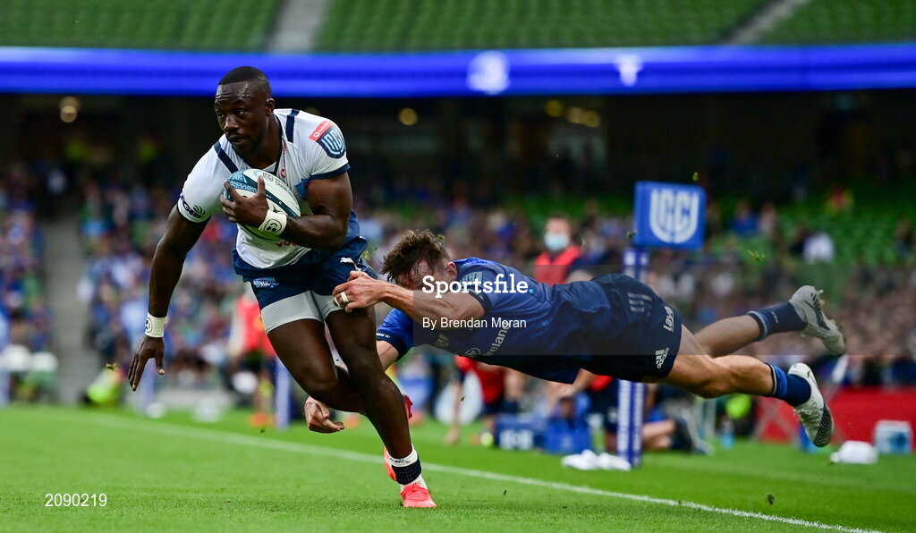 25 September 2021; Madosh Tambwe of Vodacom Bulls beats the tackle of Hugo Keenan of Leinster during the United Rugby Championship match between Leinster and Vodacom Bulls at Aviva Stadium in Dublin. Photo by Brendan Moran/Sportsfile