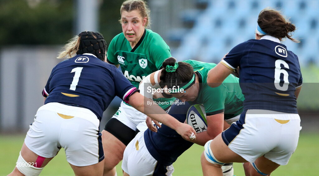 25 September 2021; Nichola Fryday of Ireland is tackled by Leah Bartlett and Rachel Malcolm of Scotland during the Rugby World Cup 2022 Europe qualifying tournament match between Ireland and Scotland at Stadio Sergio Lanfranchi in Parma, Italy. Photo by Roberto Bregani/Sportsfile