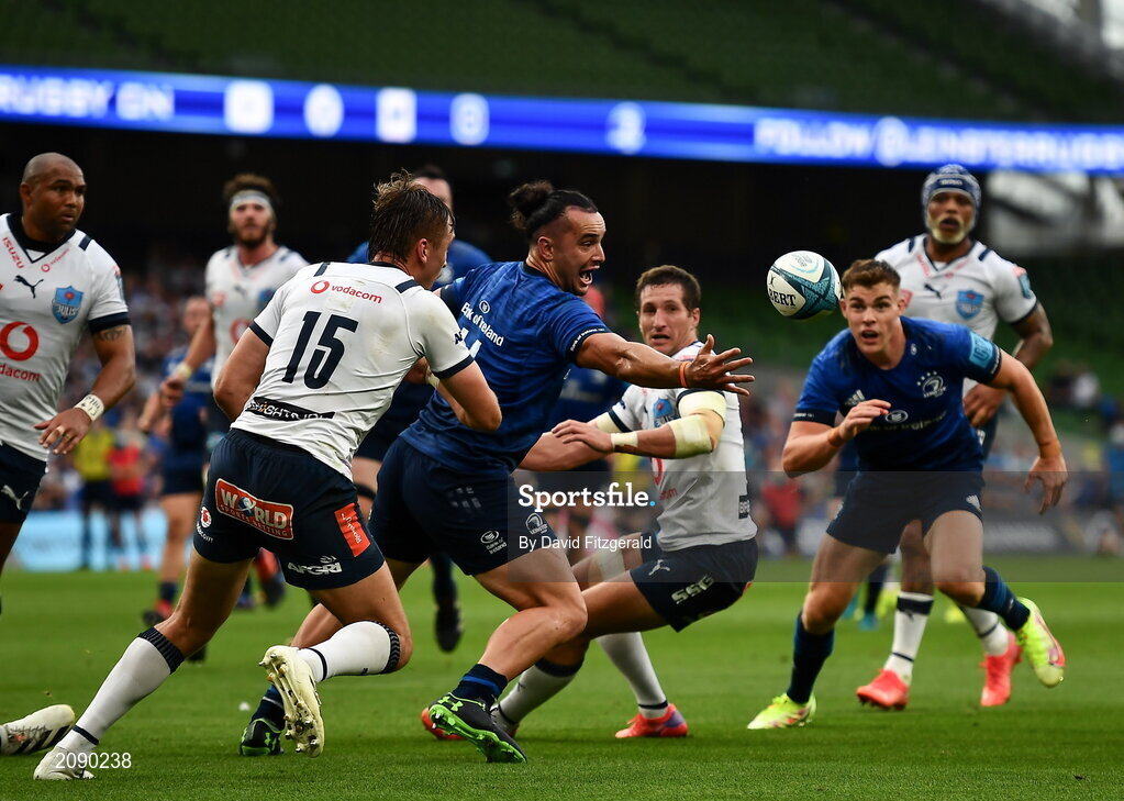 25 September 2021; James Lowe of Leinster attemps to gather the ball during the United Rugby Championship match between Leinster and Vodacom Bulls at Aviva Stadium in Dublin. Photo by David Fitzgerald/Sportsfile