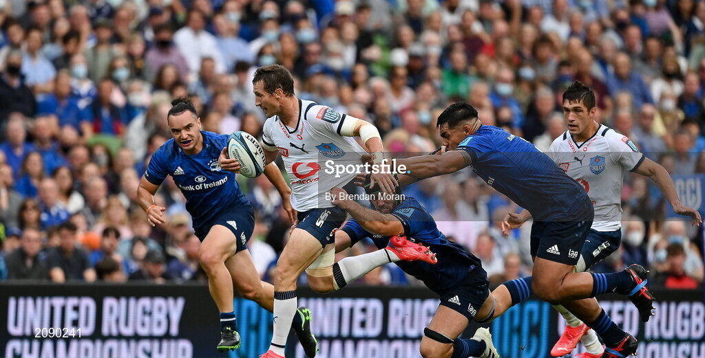 25 September 2021; Johan Goosen of Vodacom Bulls is tackled by Caelan Doris and Michael Ala’alatoa of Leinster during the United Rugby Championship match between Leinster and Vodacom Bulls at Aviva Stadium in Dublin. Photo by Brendan Moran/Sportsfile