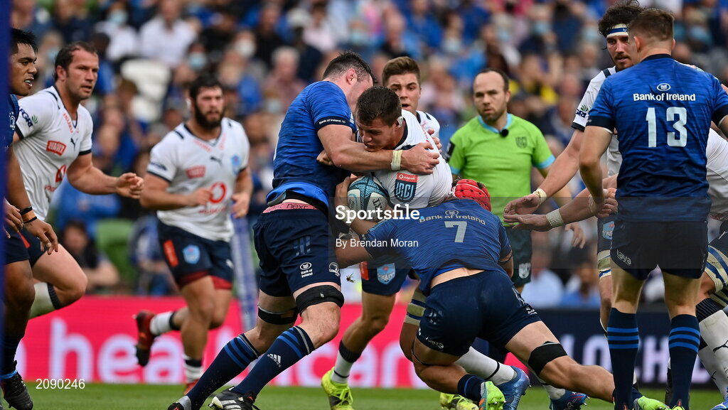 25 September 2021; Elrigh Louw of Vodacom Bulls is tackled by James Ryan and Josh van der Flier of Leinster during the United Rugby Championship match between Leinster and Vodacom Bulls at Aviva Stadium in Dublin. Photo by Brendan Moran/Sportsfile