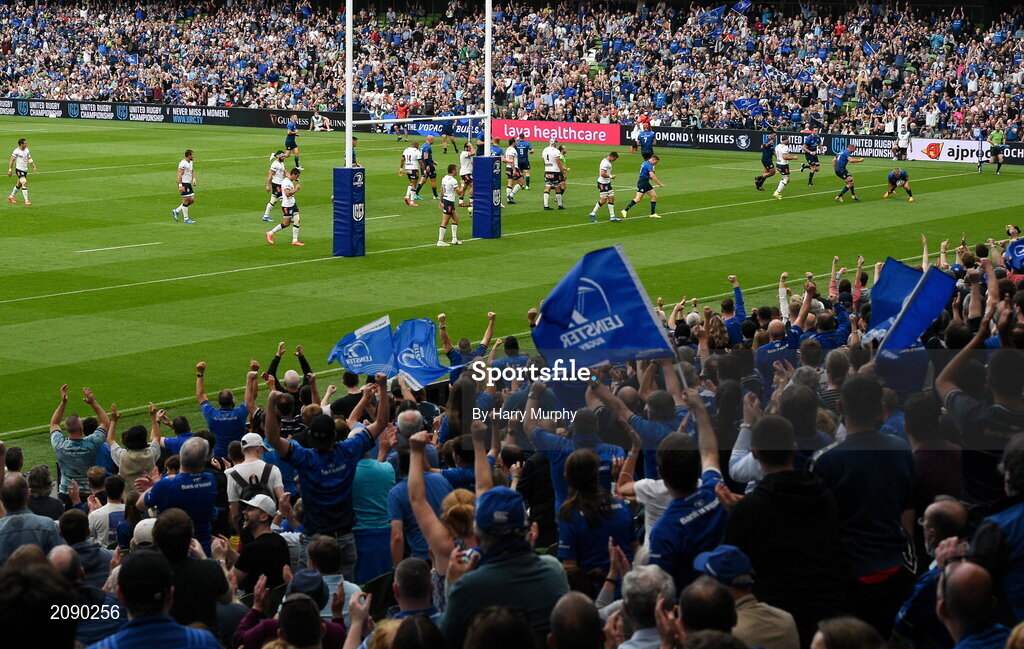 25 September 2021; Leinster supporters celebrate as Andrew Porter of Leinster scores his side's second try during the United Rugby Championship match between Leinster and Vodacom Bulls at the Aviva Stadium in Dublin. Photo by Harry Murphy/Sportsfile