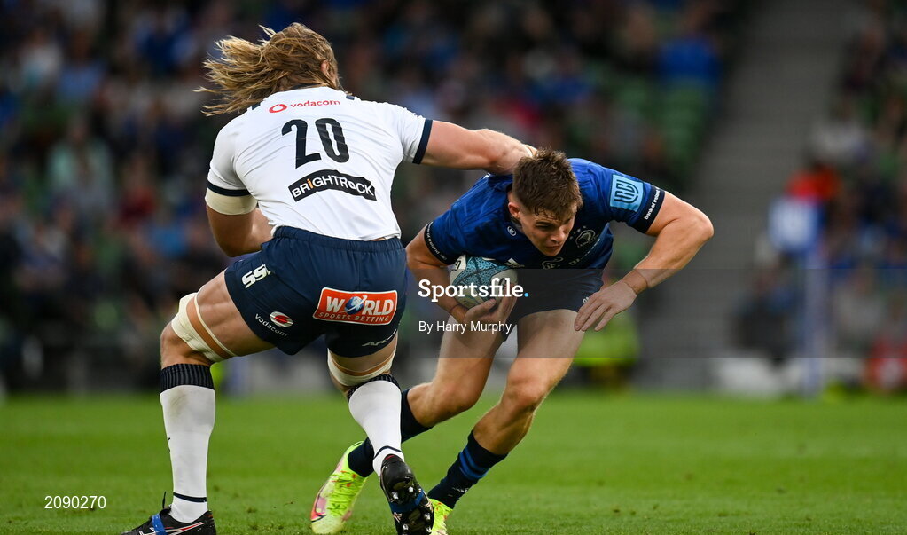 25 September 2021; Garry Ringrose of Leinster evades the tackle of Jacques du Plessis of Vodacom Bulls during the United Rugby Championship match between Leinster and Vodacom Bulls at the Aviva Stadium in Dublin. Photo by Harry Murphy/Sportsfile