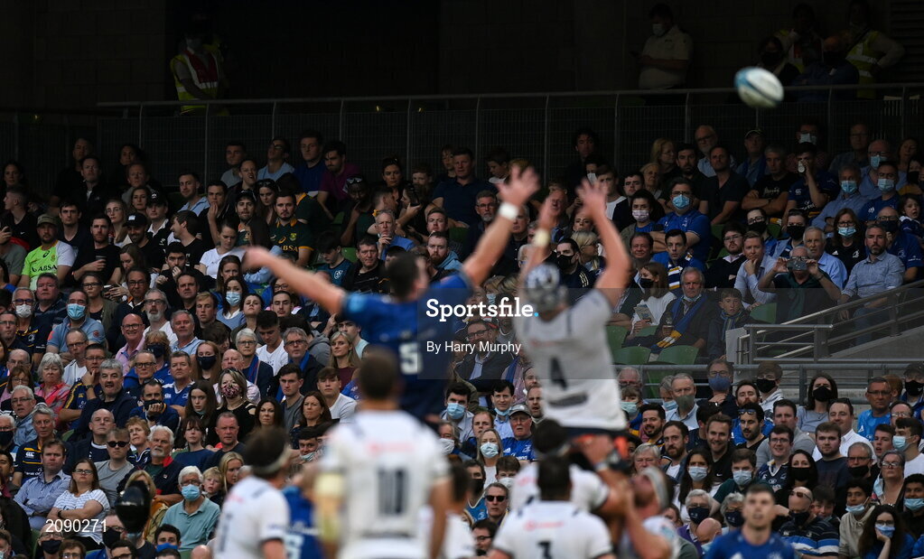 25 September 2021; Leinster supporters look on during the United Rugby Championship match between Leinster and Vodacom Bulls at the Aviva Stadium in Dublin. Photo by Harry Murphy/Sportsfile