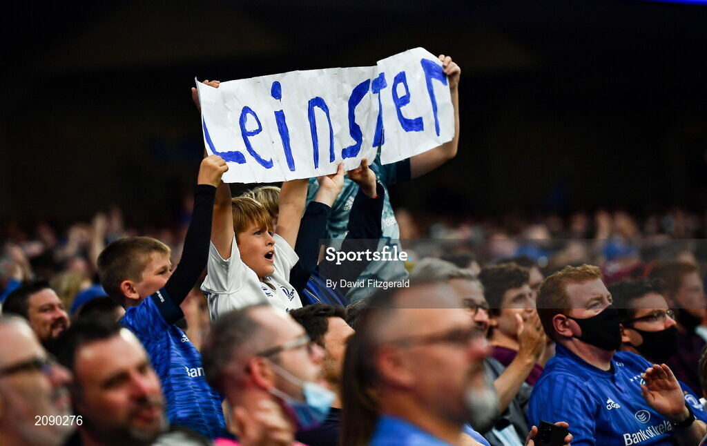25 September 2021; Leinster supporters celebrate their saide's third try during the United Rugby Championship match between Leinster and Vodacom Bulls at Aviva Stadium in Dublin. Photo by David Fitzgerald/Sportsfile