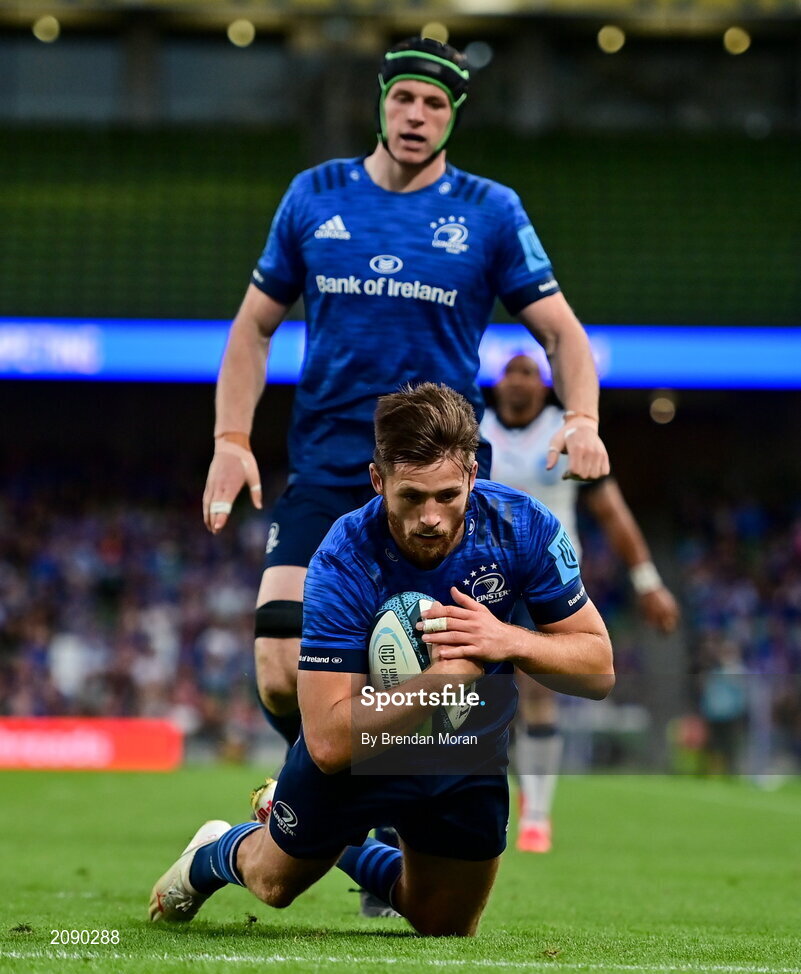 25 September 2021; Ross Byrne of Leinster scores his side's fourth try during the United Rugby Championship match between Leinster and Vodacom Bulls at Aviva Stadium in Dublin. Photo by Brendan Moran/Sportsfile