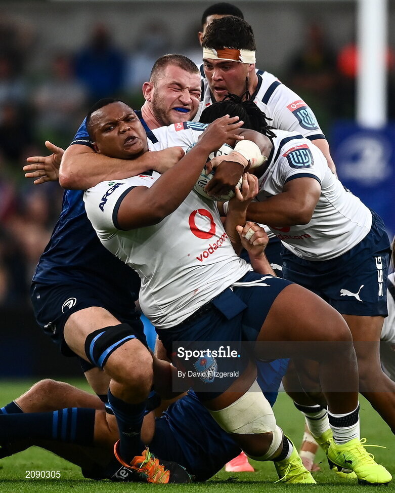25 September 2021; Simphiwe Matanzima of Vodacom Bulls is tackled by Ross Molony of Leinster during the United Rugby Championship match between Leinster and Vodacom Bulls at Aviva Stadium in Dublin. Photo by David Fitzgerald/Sportsfile