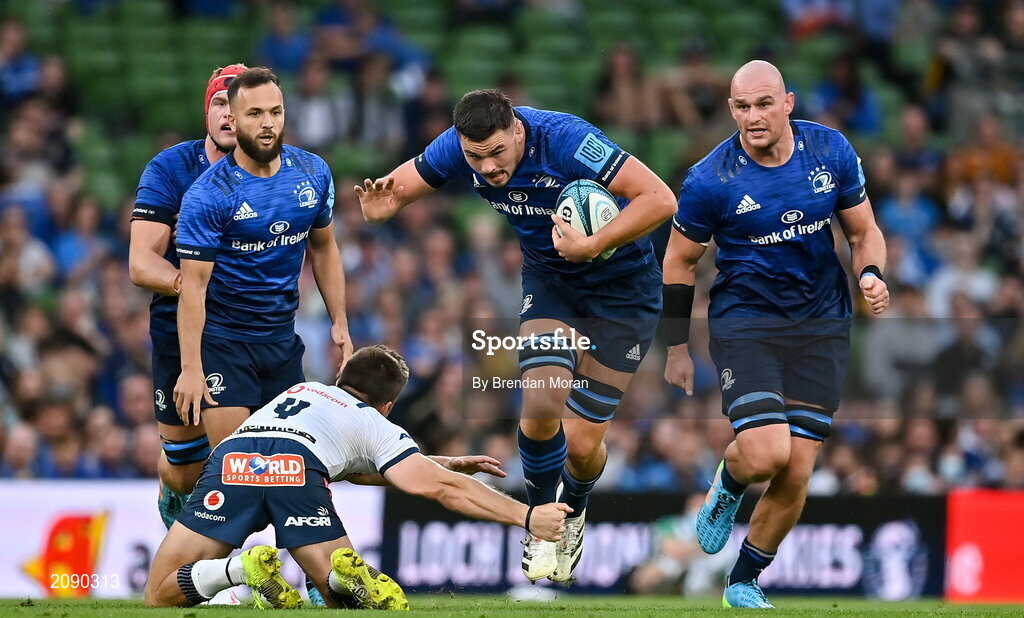 25 September 2021; Max Deegan of Leinster is tackled by Zak Burger of Vodacom Bulls during the United Rugby Championship match between Leinster and Vodacom Bulls at Aviva Stadium in Dublin. Photo by Brendan Moran/Sportsfile