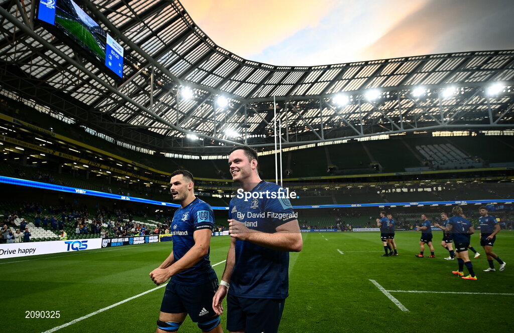 25 September 2021; James Ryan of Leinster, right, and Max Deegan following the United Rugby Championship match between Leinster and Vodacom Bulls at Aviva Stadium in Dublin. Photo by David Fitzgerald/Sportsfile