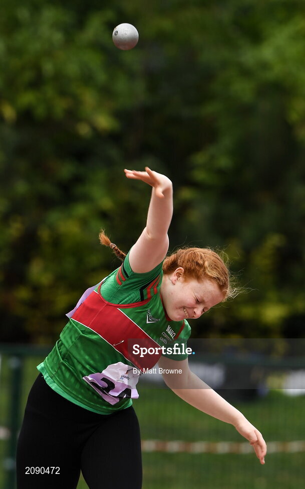 25 September 2021; Ruby Jennings from Claremorris, Mayo, on her way to finishing second in the Girls under-14 Shot Putt during the Aldi Community Games Track and Field Athletics finals at Carlow IT Sports Campus in Carlow. Photo by Matt Browne/Sportsfile