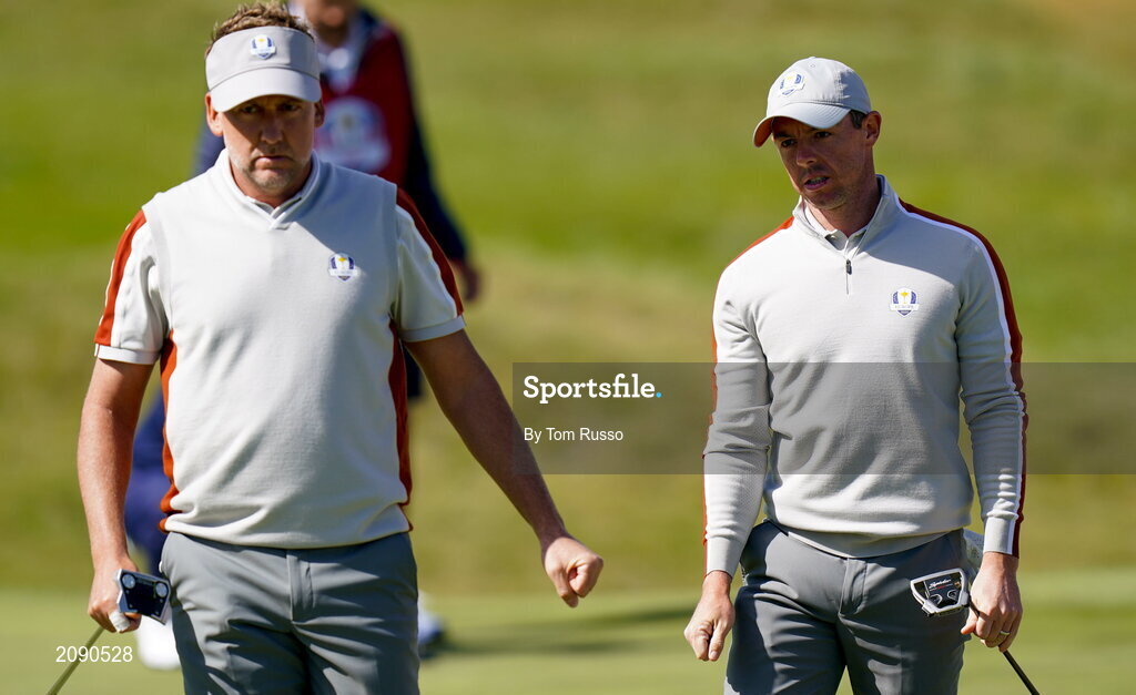 25 September 2021; Ian Poulter, left, and Rory McIlroy of Team Europe during their Saturday afternoon fourballs match against Dustin Johnson and Collin Morikawa of Team USA at the Ryder Cup 2021 Matches at Whistling Straits in Kohler, Wisconsin, USA. Photo by Tom Russo/Sportsfile