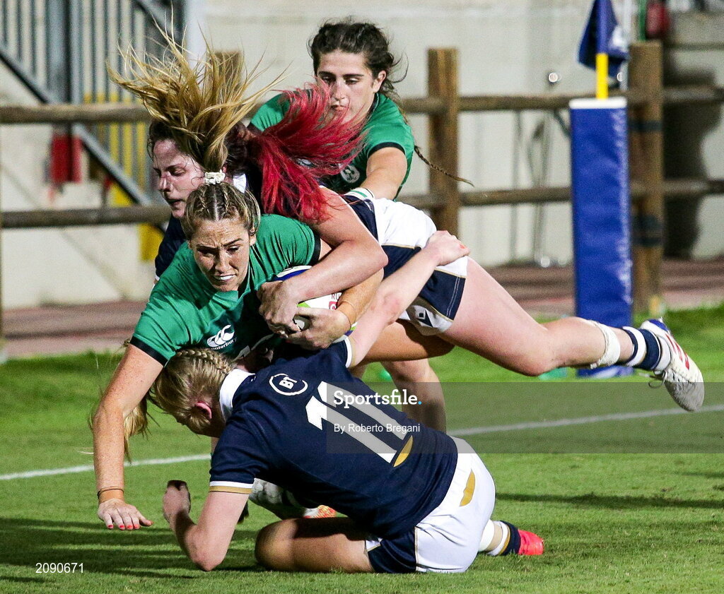 25 September 2021; Eimear Considine of Ireland is tackled by Megan Gaffney of Scotland during the Rugby World Cup 2022 Europe qualifying tournament match between Ireland and Scotland at Stadio Sergio Lanfranchi in Parma, Italy. Photo by Roberto Bregani/Sportsfile