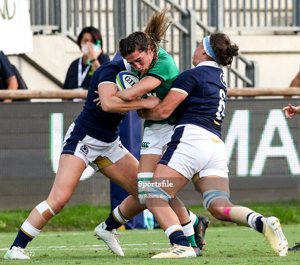 25 September 2021; Amee-Leigh Murphy Crowe of Ireland is tackled by Rachel Malcolm of Scotland during the Rugby World Cup 2022 Europe qualifying tournament match between Ireland and Scotland at Stadio Sergio Lanfranchi in Parma, Italy. Photo by Roberto Bregani/Sportsfile