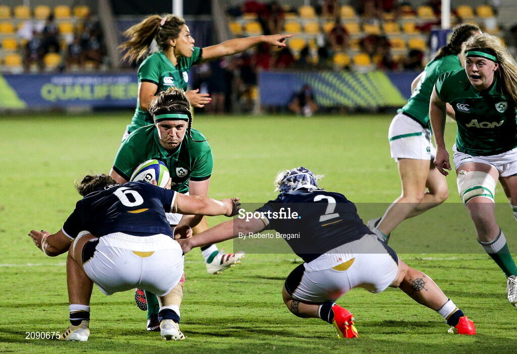 25 September 2021; Ciara Griffin of Ireland in action against Rachel Malcolm, left, and Lana Skeldon of Scotland during the Rugby World Cup 2022 Europe qualifying tournament match between Ireland and Scotland at Stadio Sergio Lanfranchi in Parma, Italy. Photo by Roberto Bregani/Sportsfile
