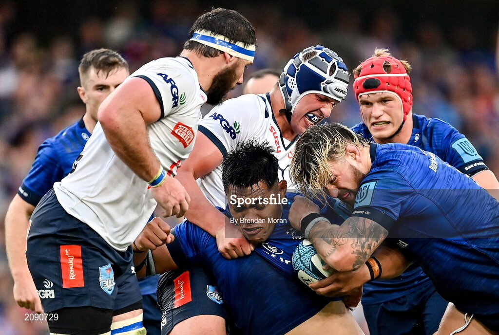 25 September 2021; Michael Ala’alatoa of Leinster is tackled by Walt Steenkamp during the United Rugby Championship match between Leinster and Vodacom Bulls at Aviva Stadium in Dublin. Photo by Brendan Moran/Sportsfile