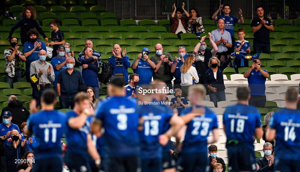 25 September 2021; Leinster supporters applaud the team after the United Rugby Championship match between Leinster and Vodacom Bulls at Aviva Stadium in Dublin. Photo by Brendan Moran/Sportsfile