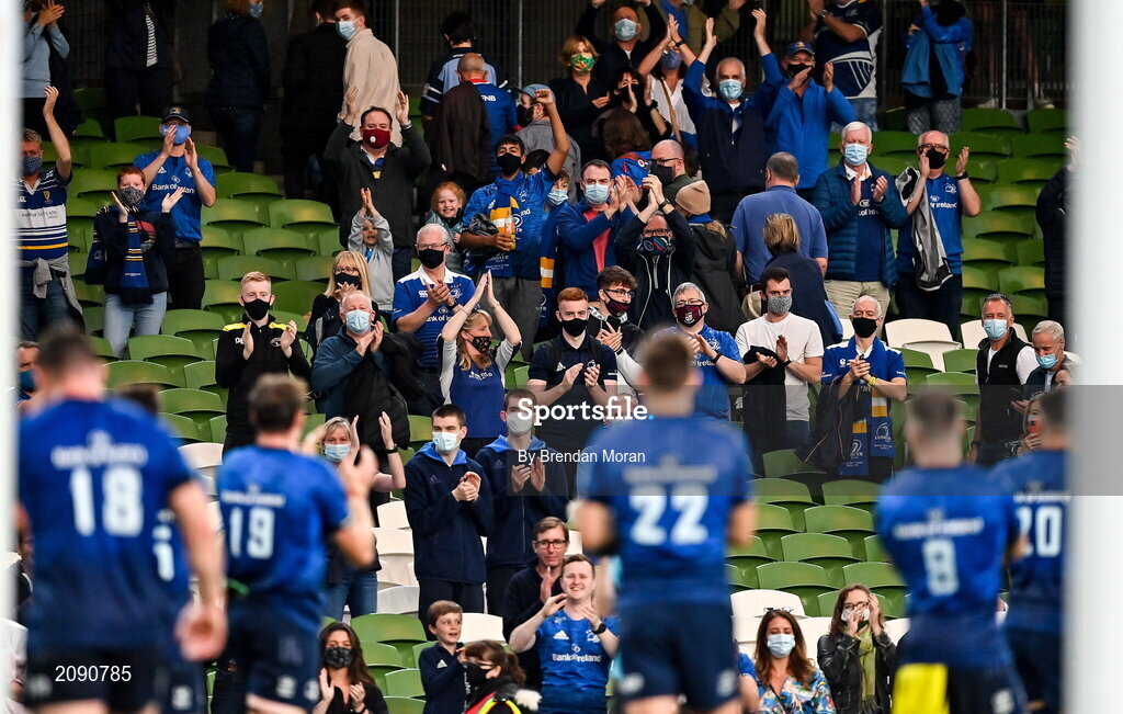 25 September 2021; Leinster supporters applaud the team after the United Rugby Championship match between Leinster and Vodacom Bulls at Aviva Stadium in Dublin. Photo by Brendan Moran/Sportsfile