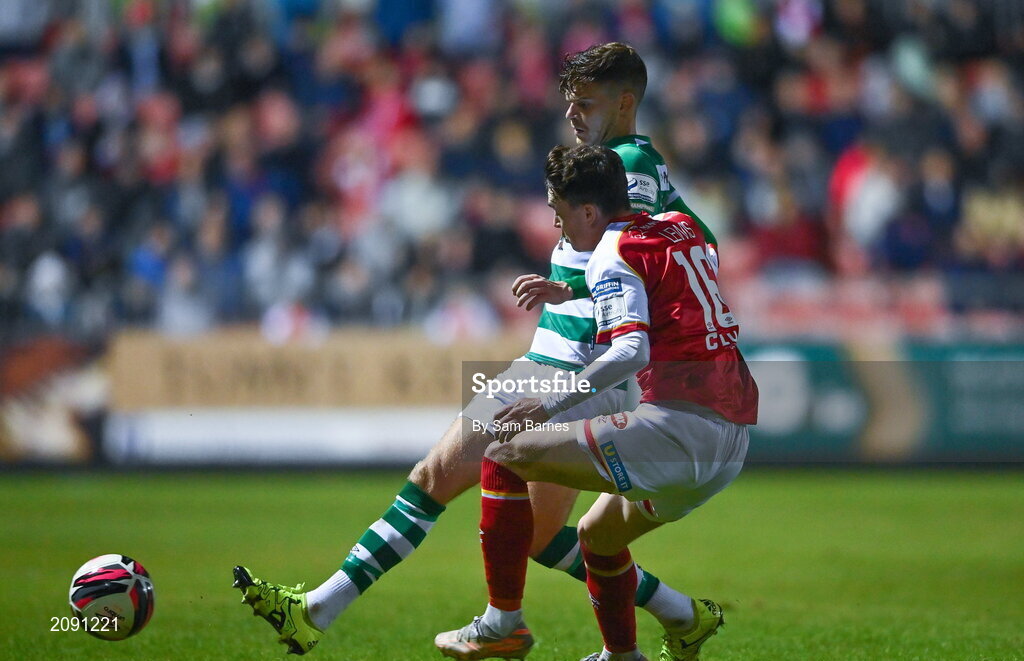 24 September 2021; Sean Gannon of Shamrock Rovers in action against Alfie Lewis of St Patrick's Athletic during the SSE Airtricity League Premier Division match between St Patrick's Athletic and Shamrock Rovers at Richmond Park in Dublin. Photo by Sam Barnes/Sportsfile