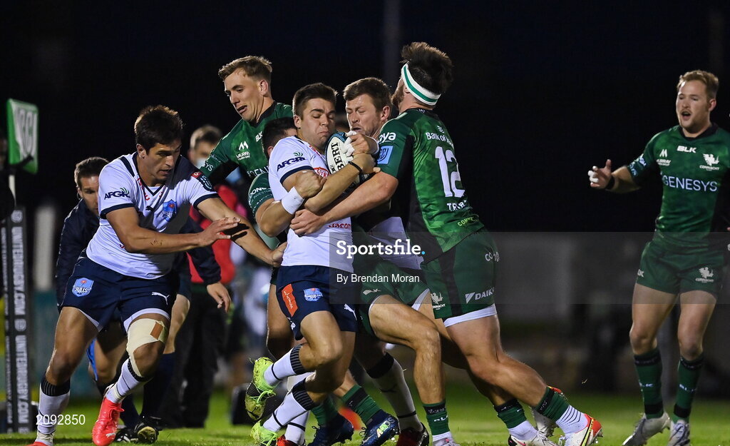 1 October 2021; Zak Burger of Vodacom Bulls is tackled by Tom Daly of Connacht during the United Rugby Championship match between Connacht and Vodacom Bulls at The Sportsground in Galway. Photo by Brendan Moran/Sportsfile