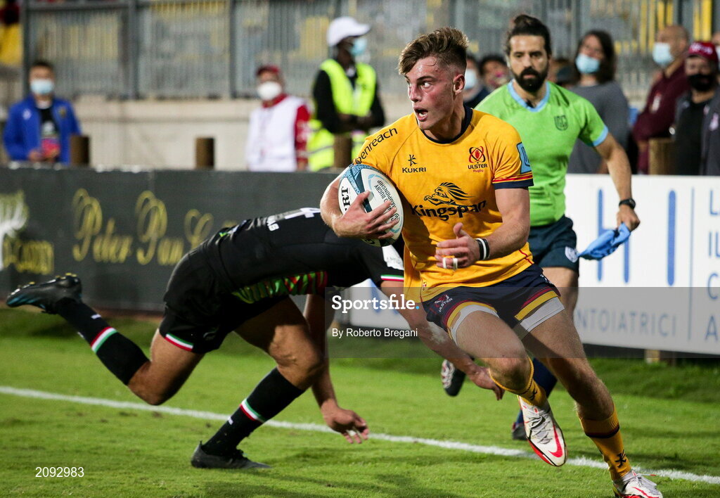 2 October 2021; Ethan McIlroy of Ulster on his way to scoring a try during the United Rugby Championship match between Zebre and Ulster at Stadio Sergio Lanfranchi in Parma, Italy. Photo by Roberto Bregani/Sportsfile