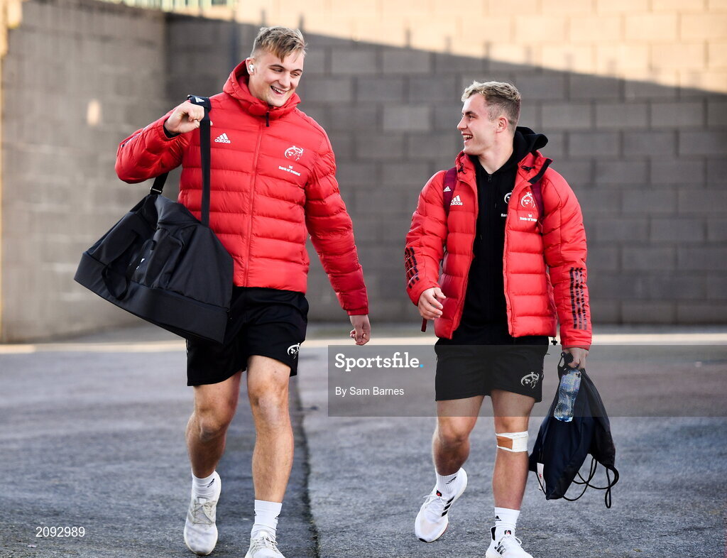 2 October 2021; Munster players Gavin Coombes, left, and Craig Casey during the United Rugby Championship match between Munster and DHL Stormers at Thomond Park in Limerick. Photo by Sam Barnes/Sportsfile