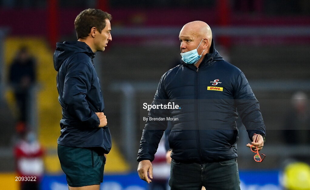 2 October 2021; Referee Andrew Brace, left, and DHL Stormers head coach John Dobson in conversation before the United Rugby Championship match between Munster and DHL Stormers at Thomond Park in Limerick. Photo by Brendan Moran/Sportsfile