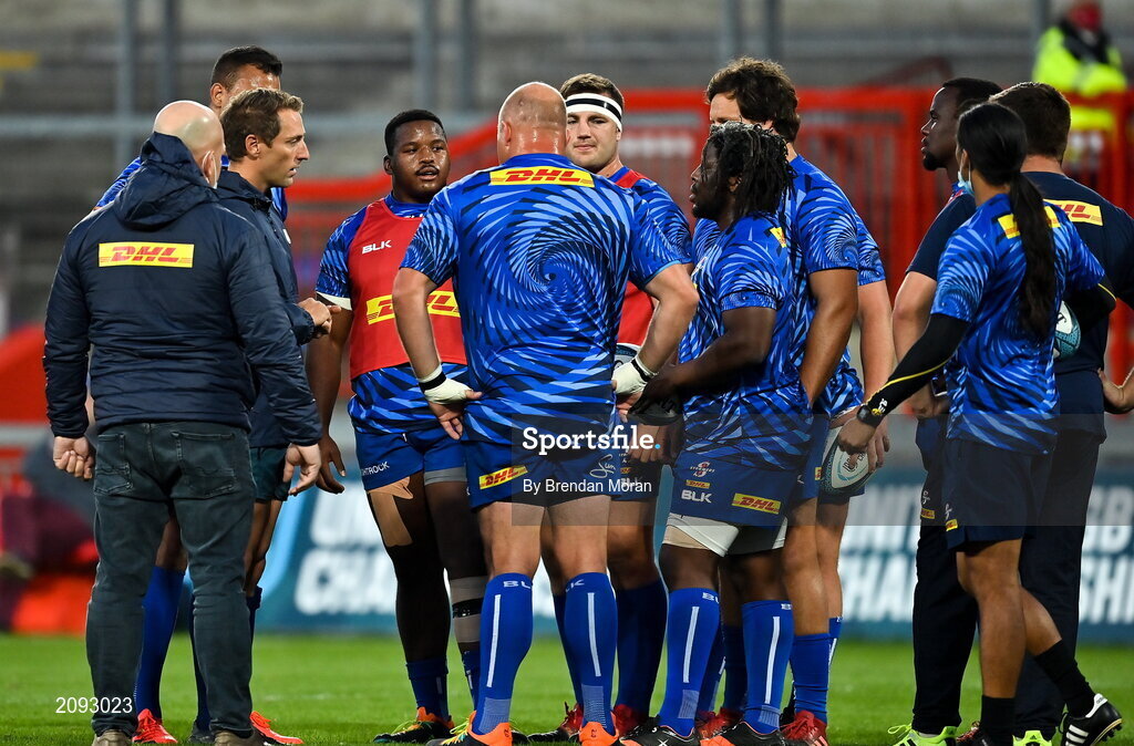 2 October 2021; Referee Andrew Brace, second from left, speaks to the DHL Stormers pack before the United Rugby Championship match between Munster and DHL Stormers at Thomond Park in Limerick. Photo by Brendan Moran/Sportsfile