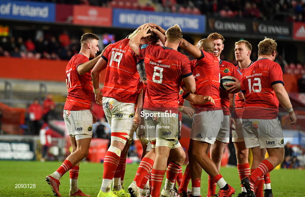 2 October 2021; RG Snyman of Munster, 19, celebrates with team-mates after scoring their side's fifth try during the United Rugby Championship match between Munster and DHL Stormers at Thomond Park in Limerick. Photo by Sam Barnes/Sportsfile
